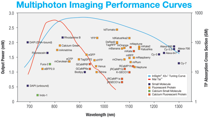 To fully exploit this capability, the system is also fitted with a tunable InSight® X3+™ laser (range of 680-1300 nm) suitable for multi-photon excitation and patented DeepSee™ dispersion compensation to deliver the shortest pulses to the sample (100 fs). Multiphoton microscopy is based on the co-incidence of 2 photons of the same wavelength at the same spot of the sample, exciting the fluorophores present in a very small volume.
